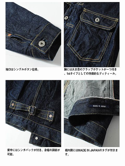 「New!!」 -HOUSTON- 1st Type DENIM TRUCKER JACKET ¥23,980(税込) 1stタイプと呼ばれる506XXを サンプリングし、203の特徴的な 耳使いを採用したヒューストンの インディゴデニムジャケット。